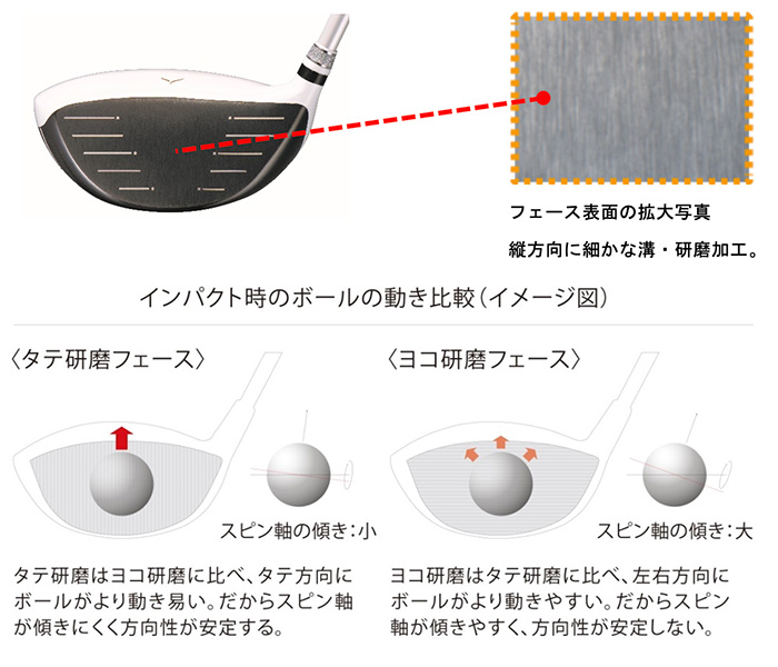 さらに、ドライバーには「バーティカルポリッシュ(縦研磨)」フェース、フェアウェイウッドとユーティリティーには斜め溝・斜め研磨フェースを採用。クラブごとに最適なフェース設計により、スピン軸の傾きを抑制し、サイドスピンを減少させ、方向安定性が向上します。