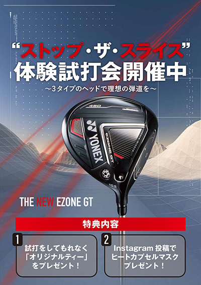 同イベントは、EZONE GT「460」、「450」、「425」ドライバーを試打された方にもれなくオリジナルティーセット、更に自身のInstagramに試打レビュー「#EZONE GT 〇〇〇 #打ってみた」のハッシュタグ付きを投稿いただいた方にヒートカプセルマスクをプレゼントいたします。