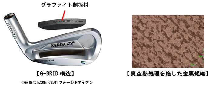 独自開発であるフェース裏内部にグラファイト制振材を複合するG-BRID(グラファイトハイブリッド)構造を採用。振動を抑えるとともに、低重心化を可能としました。さらに真空熱処理製法を用いることで、金属組織の大きさが均一になり、従来の軟鉄を凌ぐ好打感を実現いたしました。