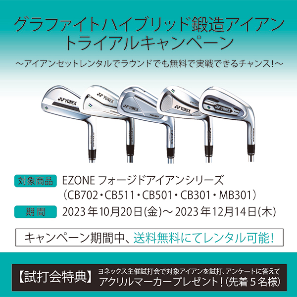 全国各地にて開催しております弊社主催試打会で試打をして、アンケートにご協力いただいた方を先着で5名様にアクリルマーカーをプレゼントいたします。また、開催期間中にヨネックスレンタルクラブサービスよりグラファイトハイブリッド鍛造アイアンをレンタルされる方の往復発送費用をサービスさせていただきます。