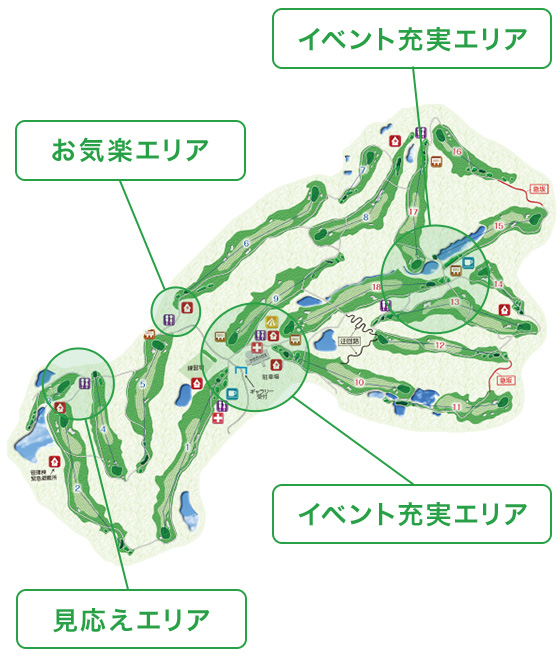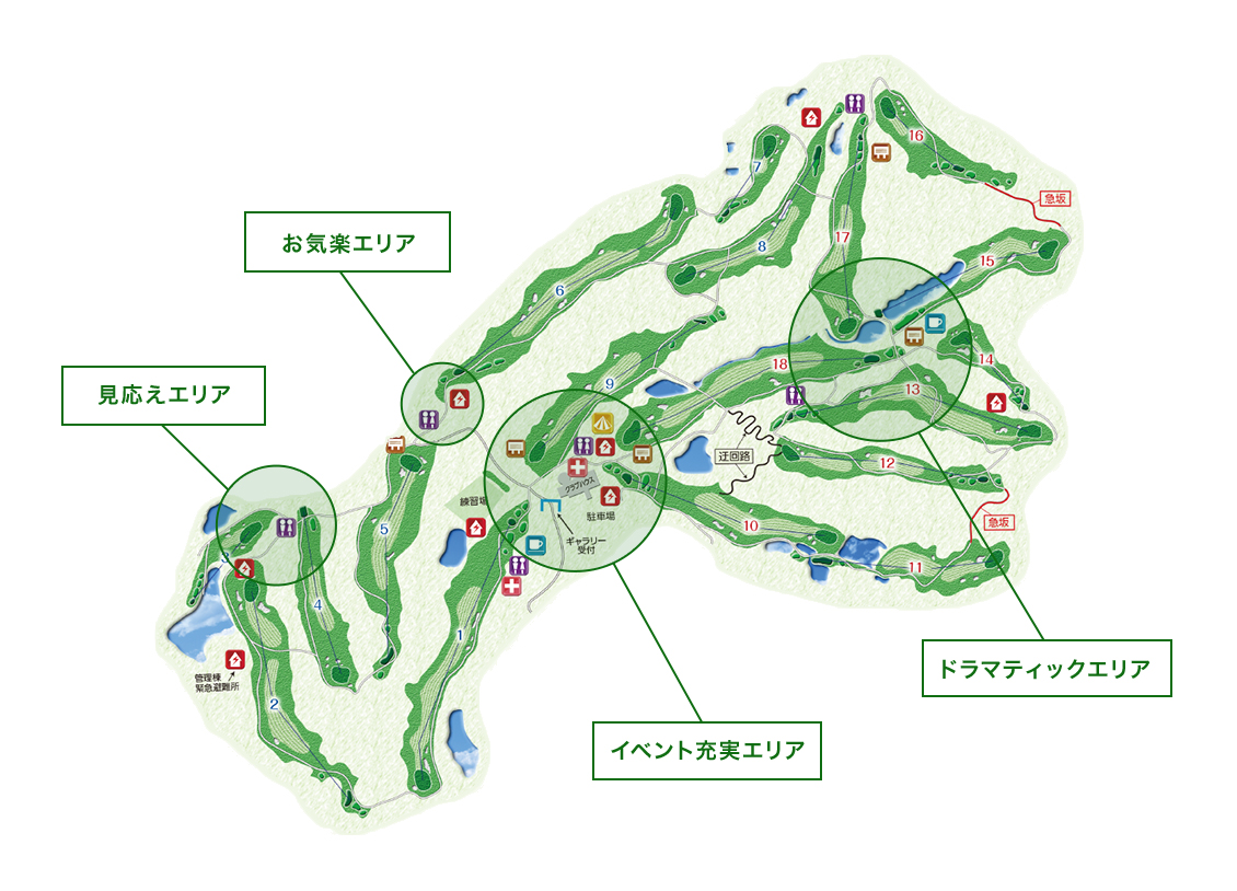 9番と18番グリーン、1番と10番ティが近く、ギャラリープラザがある人気エリア。 クラブハウス周辺では様々なイベントも開催される。