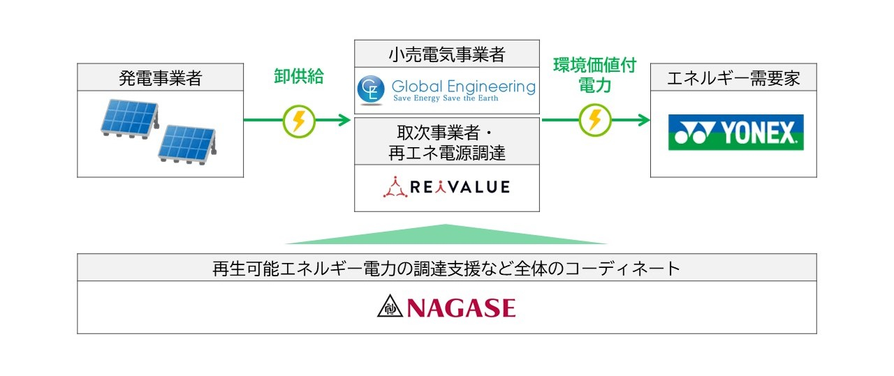 本件は、小売電気事業者である株式会社グローバルエンジニアリング(代表取締役社長:高橋 宏忠)と、取次事業者であるReivalue株式会社(代表取締役:堀口 公希)を通じて供給を受けるものであり、長瀬産業株式会社(代表取締役社長:上島 宏之)が全体の取り組みをコーディネートしています。