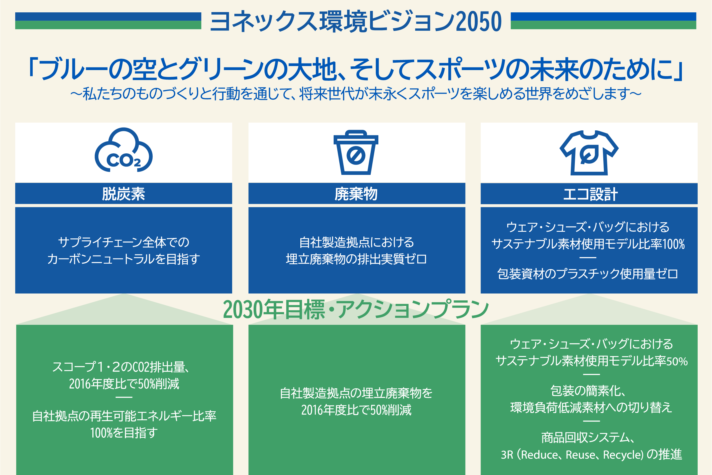 ヨネックスは、「脱炭素」「廃棄物」「エコ設計」の3つの柱とし、2050年の目指す姿と2030年の目標・アクションプランから構成される「ヨネックス環境ビジョン2050」を定めています。「ブルーの空とグリーンの大地、そしてスポーツの未来のために」を掲げ、これからも人々が末永くスポーツを楽しむことができる未来に向けて取り組みを推進していきます。