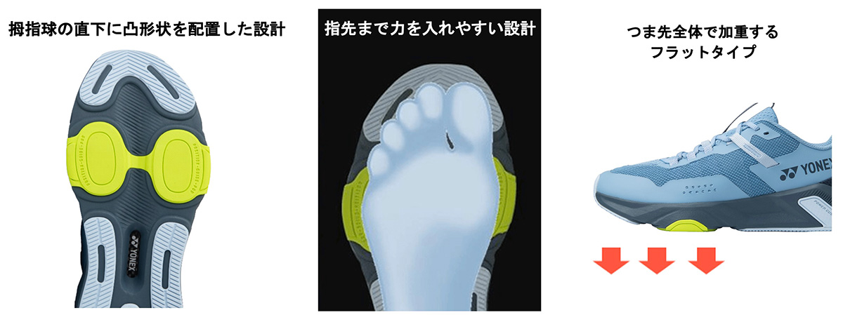 拇指球の直下にフラットタイプのポジションガイドポッドを配置。つま先全体で加重しやすい設計により、地面をつかむような足裏感覚を養い、パワーポジションを意識しやすくします。