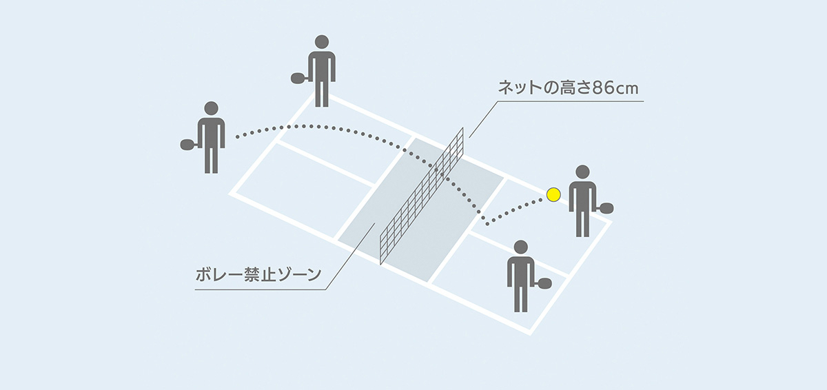アメリカで1960年代に発祥した、テニス、卓球、バドミントンの要素を組み合わせたラケットスポーツ。バドミントンと同じサイズのコートで、「パドル」と呼ばれるラケットを使い、穴のあいた軽量のプラスチック製のボールを打ち合います。