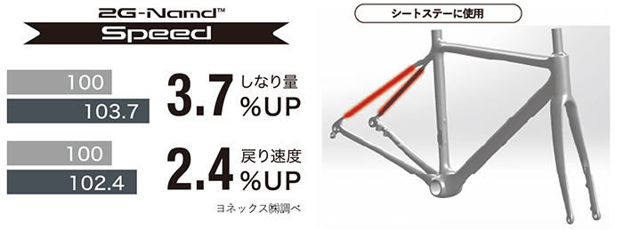 シートステーに新素材「2G-Namd™ Speed(ツージーエヌアムド スピード)※1」を採用し、静止時は通常カーボンと同等の剛性ながら、走行時はしなり量が増加し、しなり戻り速度がアップすることで、ペダリングのパワーを効率良く推進力に変えます。