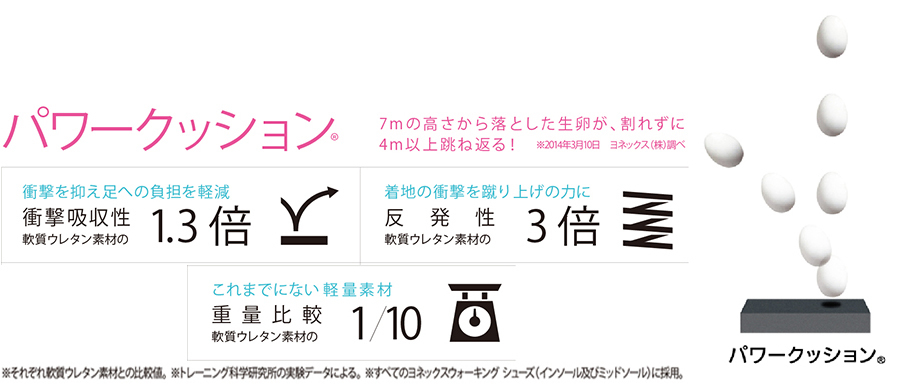 弊社シューズにおいて最大の機能であるパワークッションは、7mの高さから生卵を落としても割れずに4m以上跳ね返す衝撃吸収性と反発性を併せ持つ「軽く、疲れにくい」衝撃吸収素材です。このたび、衝撃吸収性で25%※1、反発性で12%※2もアップさせた「パワークッションプラス」を新たに開発し、つま先部とかかと部に重点配置する事で足への衝撃緩和と蹴り出しやすさを一層サポートします。