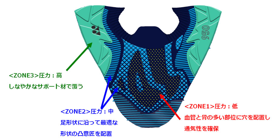 血管と神経が集中する足甲表面へのストレスを軽減する新設計。ニット素材の編み密度を足の部位ごとに最適になるよう配置し、滑らかな圧力分布を実現。