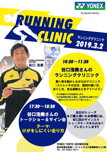 『YONEX TOKYO SHOWROOM』(港区新橋)にて世界陸上男子マラソン金メダリストの谷口浩美さんを講師に招き、ランニングクリニック&トークショー、サイン会を2019年3月2日(土)に開催します。ランニングクリニックではストレッチのやり方や走る姿勢など谷口さんが実践を交えてレクチャーします。