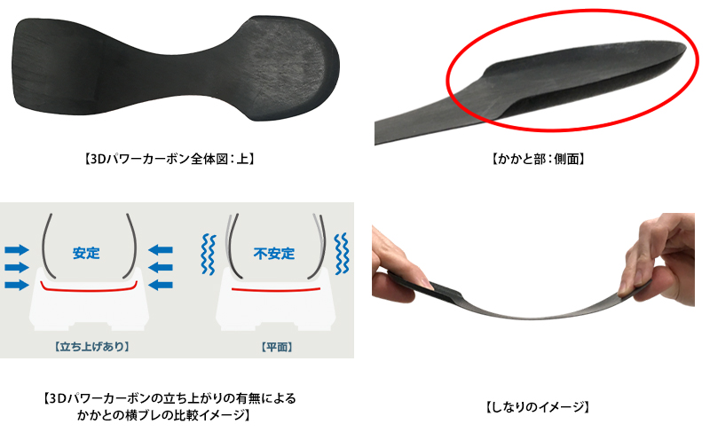 1、着地時にかかとを安定させ、走行時の筋肉への負担を軽減する「3Dパワーカーボン」