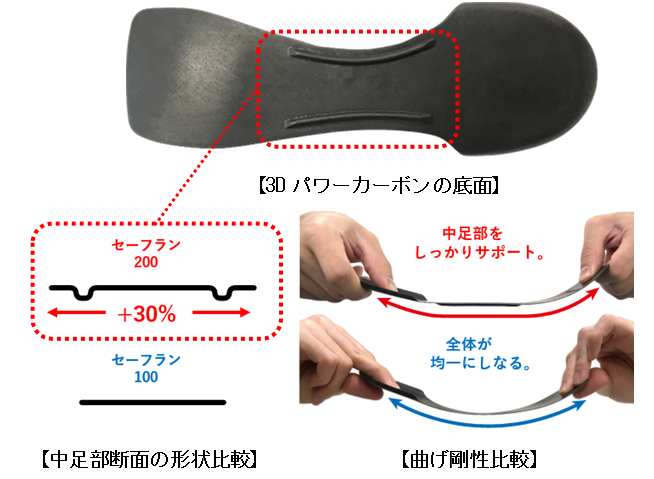 5-7分/km(フルマラソン4~5時間程度)のランナーを対象とする従来品セーフラン100に対して、セーフラン200は、7-9分/km(フルマラソン完走~ジョグ程度)のランナーを対象としています。セーフラン100に搭載の弊社のカーボンテクノロジーを結集した「3Dパワーカーボン」をもとに、より安定性に特化した形状を開発。中足部の幅を約30%拡げ、凹溝を2本設けることで、軽さを維持しつつ、安定性を強化し、ゆっくりペースランナーの筋肉の負担を軽減し、安定した走行をサポートします。