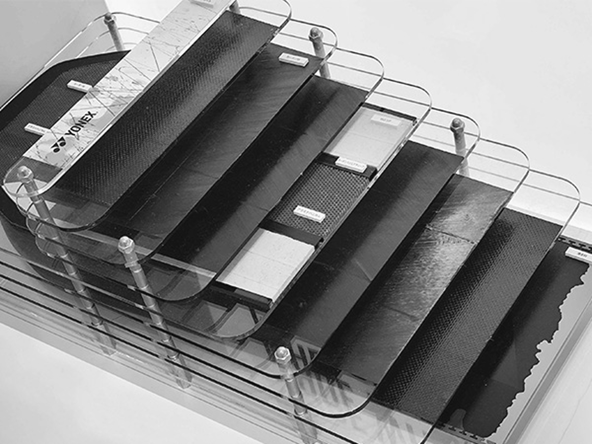 優れた軽量性、金属を超える剛性、高い反発力を兼ね備えた素材――それがカーボンです。ヨネックスがカーボンを採用する最大の理由は、設計自由度の高さ。使用するカーボンは繊維を編んでシート状にしたもので、複数層に積層。シートを真っ直ぐ重ねるか斜めに組むかで、フレックスやトーションの性質が大きく変わります。