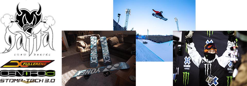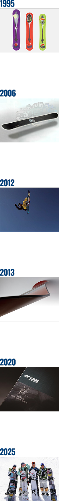1995年9月10日。スノーボードの主流がウッドコアだった時代、ヨネックスは業界初の「フルカーボングラファイト構造」を採用したボードを発表。バドミントン、テニス、ゴルフなどで培った高度なカーボン技術を応用し、「反発性としなやかさ」「耐久性と軽量性」を兼ね備えた唯一無二の性能を実現。ライダーが限界を超え、「より高く飛ぶ」ことに絶えず挑戦しています。