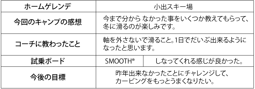 今回は参加者の方の感想を紹介させて頂きます。皆さん、沢山試乗もしていただきましたので、ヨネックスボードの感想もお伺いしました!