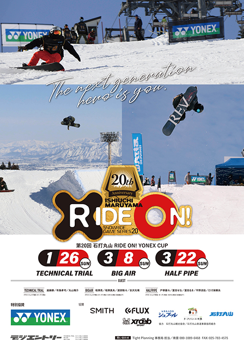 全国各地のライダーが参加し、ライディングスピリットが熱くぶつかり合う第20回 「ISHIUCHI MARUYAMA RIDE ON! YONEX CUP」が、 新潟県・石打丸山スキー場で開催されます。 テクニカルトライアル、ビックエア、ハーフパイプの3種目をレベル別に実施し、子供から大人まで世代を超えた真剣勝負が繰り広げられます。第3戦のハーフパイプ大会には、戸塚優斗・平野流佳といった世界で活躍する選手がゲストで参加し、 国際基準レベルAを満たすモンスタークラスのハーフパイプを舞台にダイナミックでテクニカルな技を披露してくれます。また、20回大会を記念して、大会出場者全員にオリジナルグッズをプレゼントします。