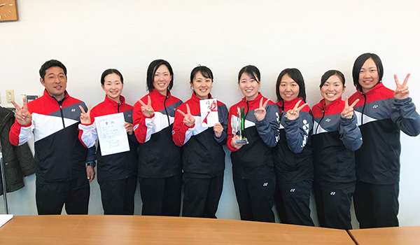 女子は初戦で、世界大会などで活躍した東芝姫路OG率いるチーム姫路と対戦。勝敗は3番手のファイナルゲームにまでもつれ込み、この熱戦を制して勢いに乗りました。準決勝では、NH農協銀行(韓国)を破り勝ち上がった日本体育大学を破り、決勝は東芝姫路と対戦。3面進行で、3番手の貝瀬ほのか・黒田麻衣が4-1で勝利すると、それに応えるように1番手徳川愛実・黒木瑠璃華、2番手井田真季・草野絵美菜も勝利し3-0で勝利。新チームで団体戦初勝利を飾り、今季幸先の良いスタートを切りました。