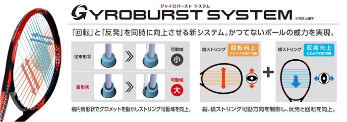 本シリーズには新構造「GYROBURST SYSTEM(ジャイロバーストシステム)」※1を採用。グロメット筒を楕円形状にすることでストリングの可動域を拡大させながら、縦ストリングがドライブ方向(左右)、横ストリングがたわみ方向(前後)に動くように制御することで、回転と反発を同時に向上させ、ヨネックス史上最大のボールの威力を生みます。