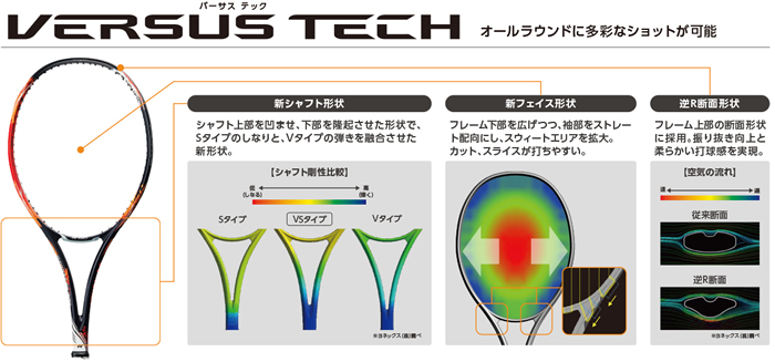 また、高強度で粘り強い新樹脂「REACT RESIN(リアクトレジン)」を複合したカーボンをラケット全体に使用することで、ラケットの柔らかさを保ちながら、すべてのサイズにおいて従来品より3g軽量化を実現。高速スウィングを可能にし、スピードラリーにも対応できます。さらに本シリーズでは、前衛(V)、後衛(S)モデルに加えて新たにオールラウンドモデル(VERSUS)を展開します。