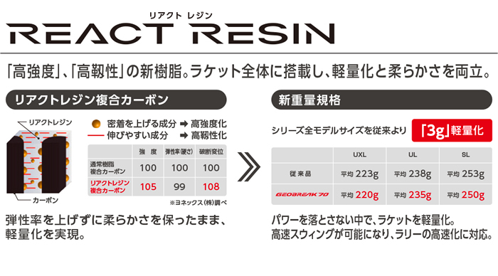 ■高強度で粘り強い新樹脂「REACT RESIN(リアクトレジン)」が軽量化と柔らかさを両立