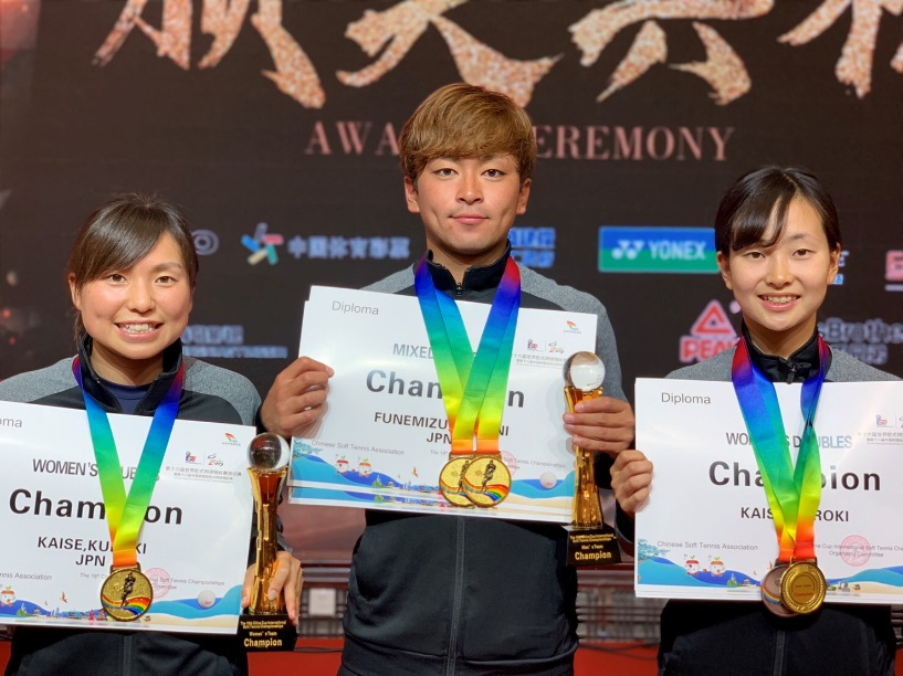 競技初日の12日には国別対抗戦が行われ、男女ともに見事優勝を飾ると勢いに乗り、13日の女子ダブルスでは貝瀬・黒木ペアが優勝。14日のミックスダブルスでは船水・泉谷朋香(東芝姫路)ペアが優勝を飾り、九島一馬(ミズノ)・貝瀬ペアが3位となりました。
