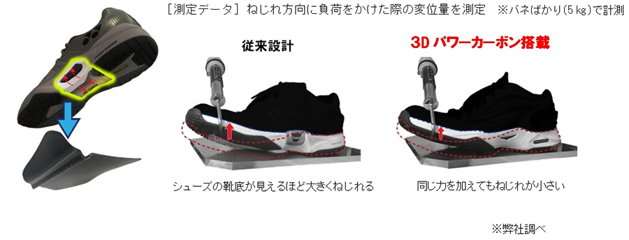 弊社独自のカーボン加工技術を活かし立体に成型した「3Dパワーカーボン」をミッドソールの中足部に搭載。従来に比べ耐ねじれ性約20%※向上。軽いだけではなく、踏ん張り時に生じるねじれを防いでパワーロスを軽減し、俊敏なフットワークを可能に。