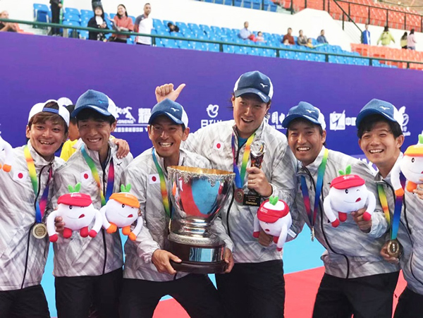 男子チームの決勝は韓国と対戦。男子はダブルス1で船水颯人・中本圭哉(福井県庁)ペアがイ スヨル・キム ジョンユンペアとの対決を逆転で制し、続くシングルスでは内本隆文(早稲田大)がキム・ジヌンに敗れたものの、ダブルス2の鈴木琢巳(福井県庁)・長江光一(NTT西日本)ペアがイ ヒョンス・パク キョチュルを終始リードし見事勝利。前回のインド大会に続く大会連覇を達成しました。