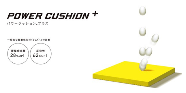 パワークッションに反発性の高い特殊樹脂を添加し、+型の溝を最適な間隔と深さで格子状に配置した新構造を採用した「パワークッションプラス」は、従来の軽量性を保ちつつ、衝撃吸収性を28%、反発性を62%アップさせ(一般的な衝撃吸収材[EVA]との比較)、12mの高さから落とした生卵が、割れずに6m以上跳ね返る新衝撃吸収反発素材です。