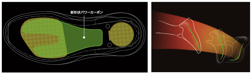 中足部から前足部の左右に伸ばした新形状の「パワーカーボンドライブ」(下図の黄緑部分)が中足部のねじれを防ぎ、安定性を図るとともに、屈曲時のソールの復元をアシスト。前足部とかかと部に搭載したパワークッションプラス(下図の黄色部分)との相乗効果で、次の一歩を踏み出す推進力を生み出します。