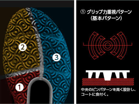 下図①(赤)は中央のピンパターンを他のピンパターンより高く設計し、コートに食付きやすくすることで、グリップ力を向上。