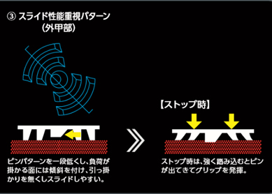 ストップ時は強く踏み込むと、左右のピンが斜めに流れ、中央のピンがコートに刺さり、グリップ力を発揮します