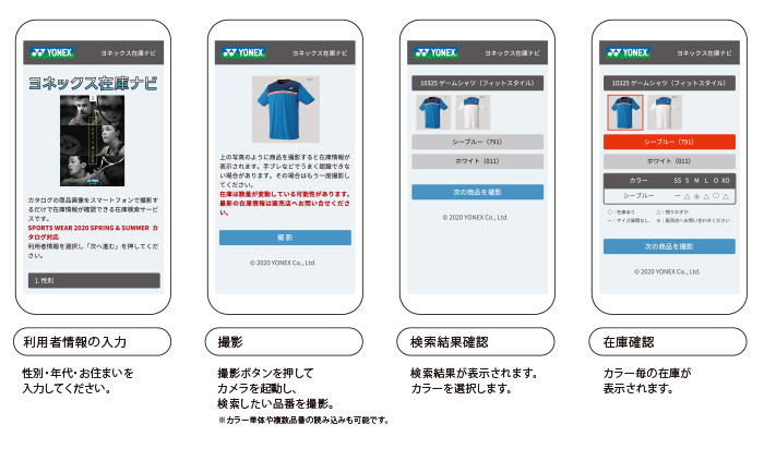 ヨネックスでは、カタログの商品画像をスマートフォンで撮影するだけで在庫情報を確認できる在庫検索サービス「ヨネックス在庫ナビ」を開始いたしました。