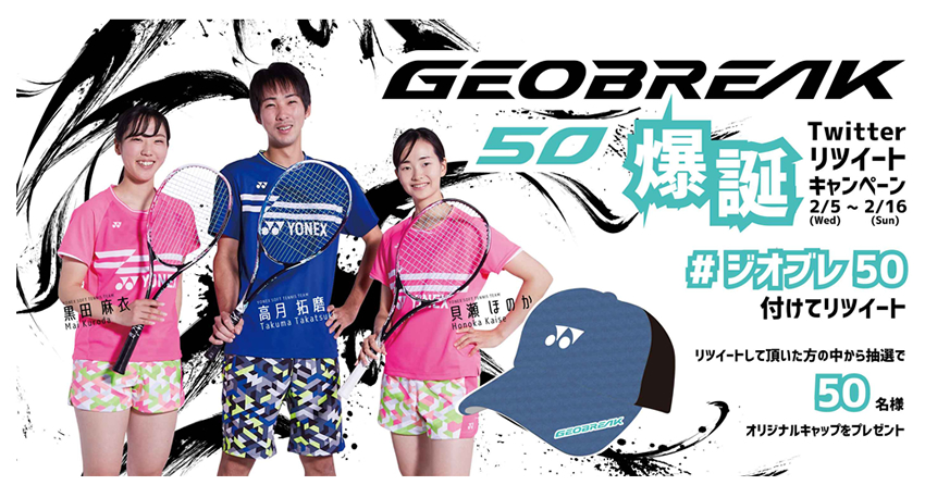 大好評のソフトテニスラケットGEOBREAKシリーズ第2弾「GEOBREAK 50」の発売を記念いたしまして、「GEOBREAK 50爆誕リツイートキャンペーン」を開催いたします。ツイッター上で"#ジオブレ50"を付けてリツイートしていただいたお客様の中から抽選で50名様にGEOBREAKロゴ入りのオリジナルキャップをプレゼントいたします。