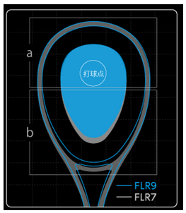 打球するフレーム上部は90平方インチ同等のスウィートエリアを維持しつつ(a)、フレーム下部は大幅にスリム化(b)し、90平方インチの反発と85平方インチの操作性を両立。