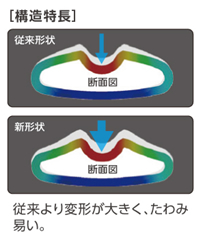 変形が大きくたわみやすい新断面形状が打球衝撃を軽減し、扱いやすいマイルドな打球感を生み出します。