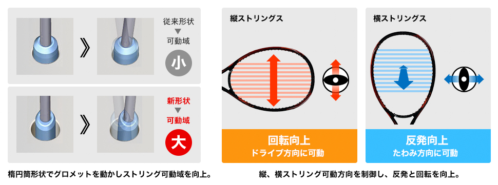 グロメット筒を楕円形状にすることで、ストリングの可動域が拡大。縦ストリングはドライブ方向(左右)に動いて回転を向上させ、横ストリングはたわみ方向(前後)に動いて反発を向上させます。
