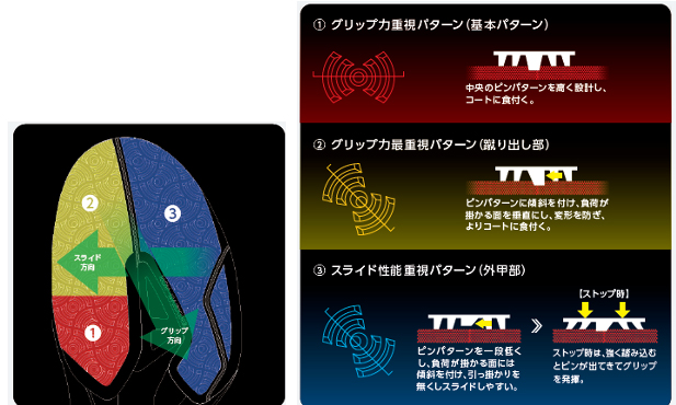 下図②(黄色)は中央のピンパターンの片側に傾斜を付け、もう一方の側をコートに対して垂直に刺さる設計とすることで、蹴り出しで掛かる負荷を垂直面で受け止め、ピンパターンの変形を防ぎ、コートに食付きます。