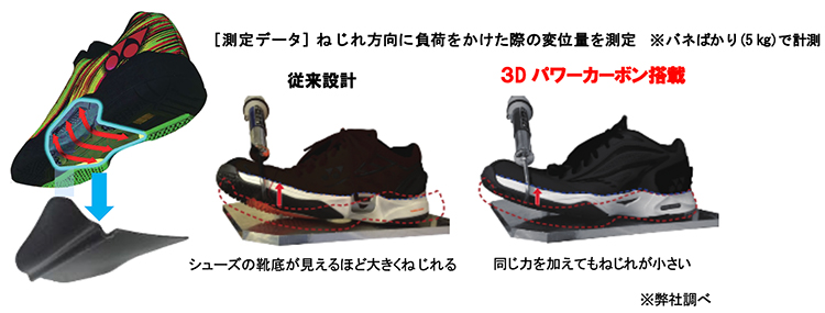 さらに、耐ねじれ性能が約20%向上※3する弊社独自の「3Dパワーカーボン」を中足部に搭載し、軽さを維持しながらもシューズのねじれや曲りを抑えて安定感を高め、俊敏なフットワークを支えます。