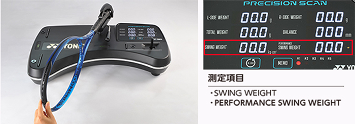 さらに、従来のスウィングウェイト(振った時の重さ)に加え、重量とバランスの測定結果を反映した弊社独自の新指標「パフォーマンススウィングウェイト※2」を測定。プレーヤーの体感にさらに近づけた適正な数値を算出することで、ユーザーに最適なラケットやカスタマイズを提案し、快適なプレーをアシストします。