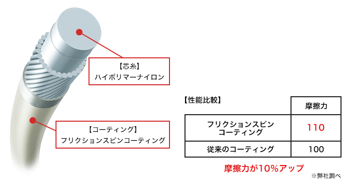 構造:モノフィラメント 素材:芯糸/ハイポリマーナイロン 側糸/ハイポリマーナイロン・ワインディング加工 コーティング:フリクションスピンコーティング |