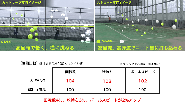 これら新テクノロジーの採用により、回転数4%※、球持ち3%※、ボールスピードが2%※アップし、ハイスピンボールでより攻撃的なプレーをサポートします。