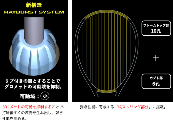 さらに、縦ストリング部分のグロメットにはリブを付け、可動域を抑制して反発力を高める新グロメット構造「RAYBURST SYSTEM(レイバーストシステム)」※2を搭載。また、強度と高弾性を併せ持つ新カーボン素材「トレカ®M40X」※3をフレームトップ部に配置。これらの新設計・新素材により、ボールスピード5.7%※1、回転数が5.9%※1アップし、威力のあるスピードショットを実現します。
