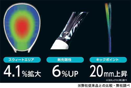 フレーム上部を広げ、スウィートエリアを4.1%拡大。剣先部はねじれを抑える形状にすることで剛性を高め、キックポイントを上方へ約20mm移動。打球時のレスポンスを向上させ、素早いキックバックを生むことで、弾き性能を高めます。