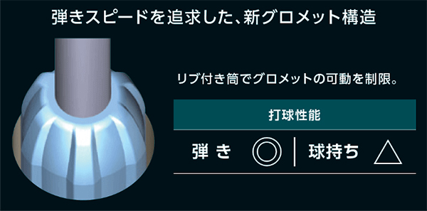 縦ストリング部分のグロメットにリブを付け、可動域を抑制することで反発性能を高めます。