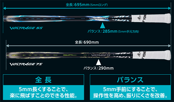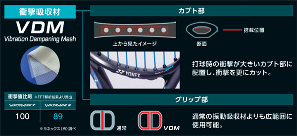 VOLTRAGE 5の独自テクノロジーとして、従来搭載されているグリップ部に加えて、打球時の衝撃が大きいカブト部に新振動吸収素材「Vibration Dampening Mesh(VDM)」を採用し、マイルドですっきりした打球感を実現。また、VOLTRAGE 5Sは全長を長くバランスポイントを手元方向とした新設計により、楽に飛ばせる性能と操作性を両立させました。