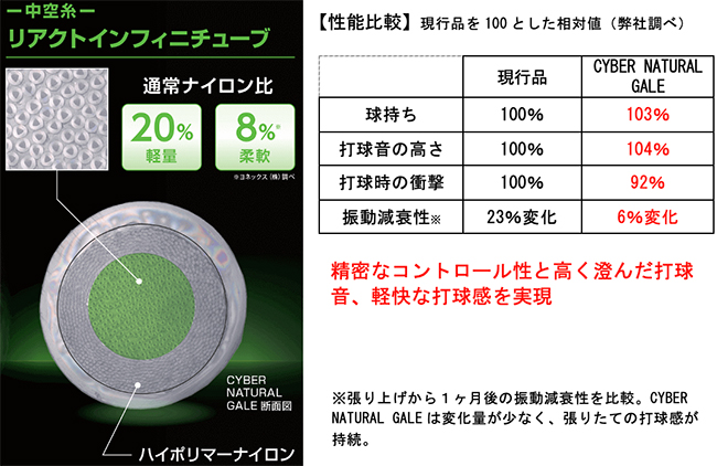 CYBER NATURAL GALEは、芯糸に中空構造の「リアクトインフィニチューブ」を採用したマルチフィラメントストリングで、高いホールド感と軽快な打球感を両立するとともに、高い打球音を生み出します。またカラーバリエーションもVOLTRAGE5シリーズとリンクし、セットでご使用いただけます。