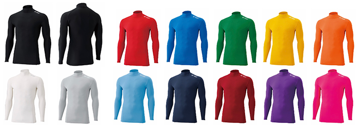 「JUNIORハイネック長袖シャツ」左上からブラック、ブラック(背面)、レッド、ブルー、グリーン、イエロー
