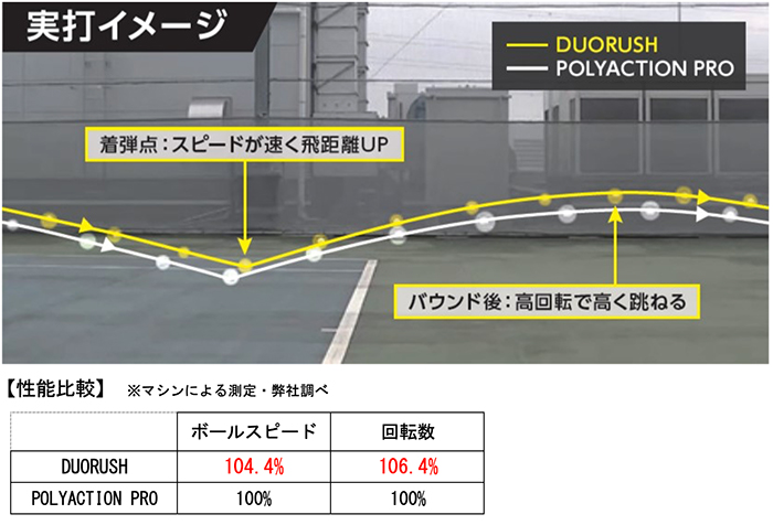 2つのストリングを組み合わせることで、ボールスピードは4.4%※、回転数は6.4%※アップ。弾きの良さがありながら、ハードヒットでコートに収められるストリングです。