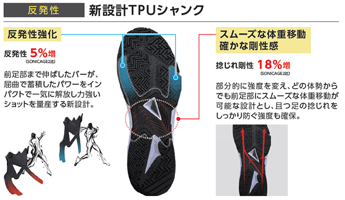 ソールには、柔軟性と剛性を併せ持つTPU樹脂製のシャンクを使用した新設計を採用し、反発性とねじれ剛性がアップ。スムーズな体重移動とパワーショットをアシストします。