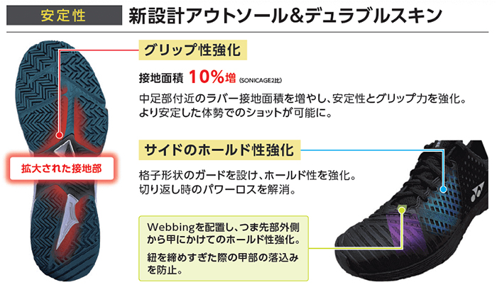 さらに、アウトソールは中足部付近のラバー設置面積を増やして安定性とグリップ性を高め、アッパーのサイドには格子形状のガードを設置しホールド性を強化。切り返し時のパワーロスを解消し、より安定した体勢でのショットを可能にしました。