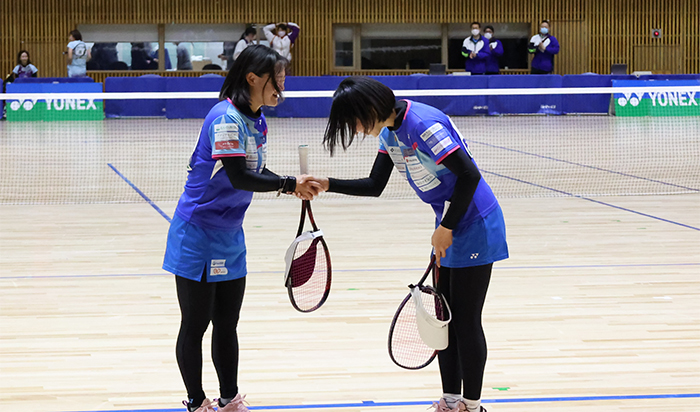一方の女子ではまさに2022年度を飾るに相応しい豪華メンバーが参戦。それを象徴するかのようにベスト4は全日本選手権と同じ顔触れに。決勝では個人戦としてはラストマッチになる「インドア女王」高橋・半谷(どんぐり北広島)と全日本インドアでの初優勝で勢いに乗る貝瀬・渡邉(ヨネックス)が激突。今シーズン4度目の両者の対戦は、毎回競ったラリーとなりますが、ラストマッチにかける思いと、引退する半谷選手への有終の美を送りたい高橋選手の気持ちが貝瀬・渡邉を振り切り4-1で見事勝利しました。